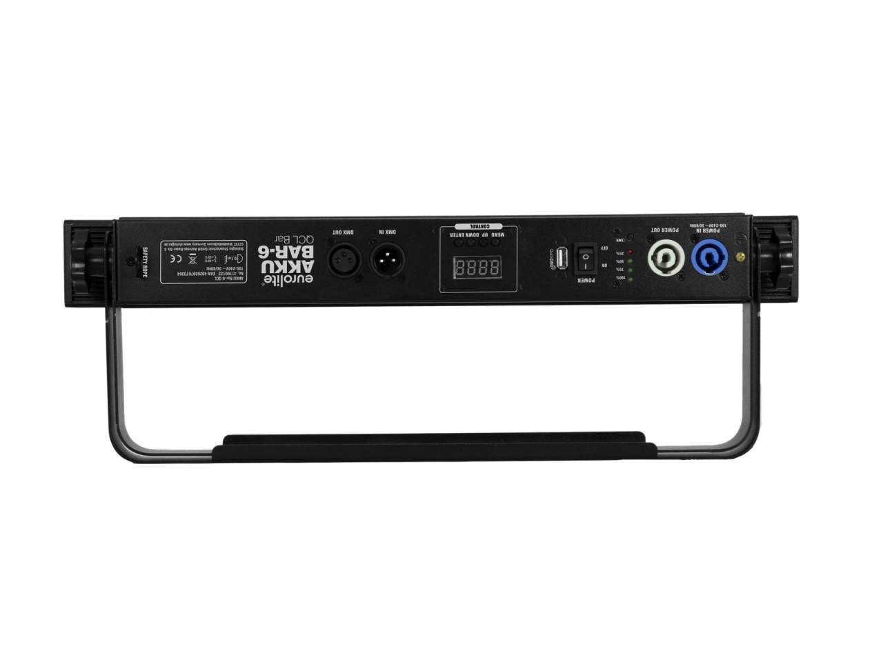 AKKU-LED-Leiste mit 4in1-LEDs und IR-Fernbedienung 6 leistungsstarke 8-W-RGBW-LEDs (4in1) Jede LED kann via DMX einzeln oder in Segmenten mit je 2 oder 3 LEDs angesteuert werden Kompakt und lichtstark Betrieb ?ber Netzanschluss oder eingebautem Lithium-Ionen-Akku mit bis zu 11 Stunden Betriebszeit Integrierte Showprogramme im Auto- und Musikmodus Stufenlose RGBW-Farbmischung, statische Farben, Farbwechsel, Farb?berblendung, Dimmer, interne Programme und Strobe-Effekt mit variabler Geschwindigkeit Dimmergeschwindigkeit (Sprungantwort) einstellbar Integrierte Ladeautomatik mit Ladeanzeige Zus?tzliche milchige Diffusorscheibe f?r ein homogenes und weiches Licht Adressierung und Einstellungen ?ber Steuereinheit mit 4-stelliger LED-Anzeige Schaltnetzteiltechnologie f?r Netzspannung zwischen 100 und 240 Volt Schwenkbarer Montageb?gel Zus?tzlicher B?gel zum Aufstellen am Boden P-Con-Netzansc…
