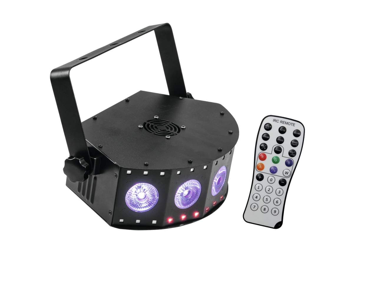 LED-Scheinwerfer mit 2-fachen Effekten: RGB+UV-LEDs, dynamischen Farbeffekten und Strobe 5 Linsen mit leistungsstarken 4-W-4in1-LEDs f?r RGB-Strahleneffekte und UV-Licht 30 x 0,2-W-RGB-LED f?r dynamische Farb- und Strobe-Effekte RGB-LEDs oberhalb und unterhalb der Linsen sind in Gruppen zu je drei LEDs separat ansteuerbar 3 integrierte Showprogramme im Auto- und Musikmodus Direkte Farbwahl f?r 15 Farben RGB+UV- und RGB-Strobe-LEDs separat steuerbar f?r den Einsatz als Schwarzlicht, Stroboskop oder PAR-Scheinwerfer Adressierung und Einstellungen ?ber Steuereinheit mit 4-stelliger LED-Anzeige Bequeme Fernsteuerung per mitgelieferter IR-Fernbedienung EUROLITE IR-7 Schwenkbarer Montageb?gel Durchschleifausgang zur Spannungsversorgung von bis zu 8 Ger?ten LED: 30 x SMD 0,2 W 3in1 TCL RGB (homogene Farbmischung) LED: 5 x high-power 4 W 4in1 QCL RGB/UV (homogene Farbmischung) Im 1; 4; 20 CH …